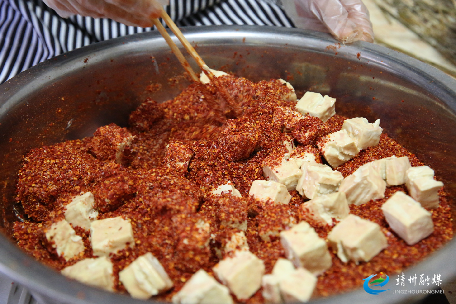 豆腐发酵完成后,制作进入“入味”环节。王文婷先把发酵好的豆腐块放入米酒中快速浸泡过滤,再倒入提前拌匀的辣子粉与食盐中,轻轻翻滚,确保每块豆腐均匀裹上调料。