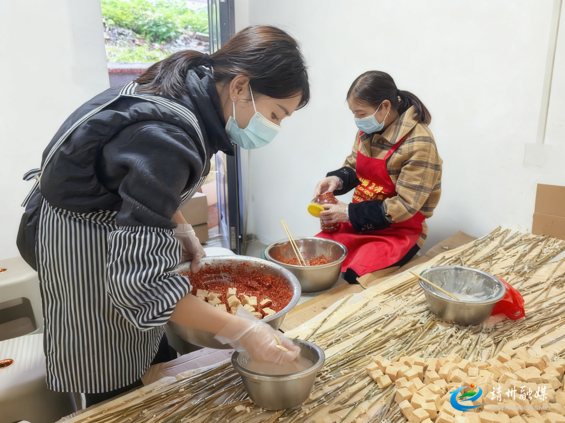 王文婷和她的母亲正在给发酵好的豆腐用酒过滤、裹上辣椒粉并装瓶(钦苏芬 摄)