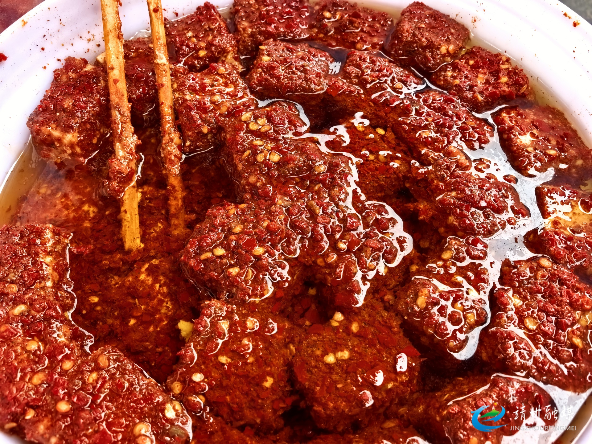 被红油包裹住的霉豆腐(周悦伊 摄)