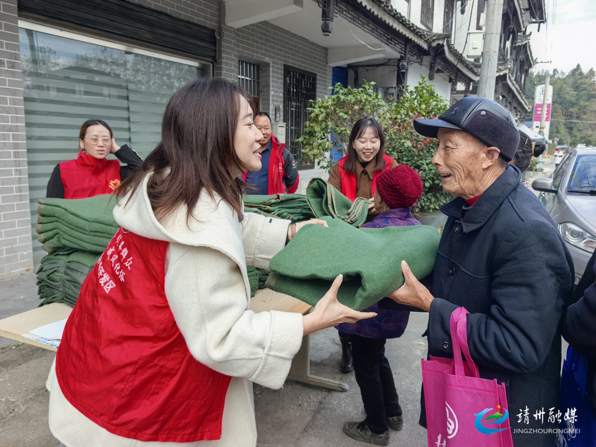 “叔,天气冷了,注意身体啊!”物资发放区,志愿者们为老人们共计发放160床毛毯、70件棉衣,并耐心叮嘱他们要注意保暖。