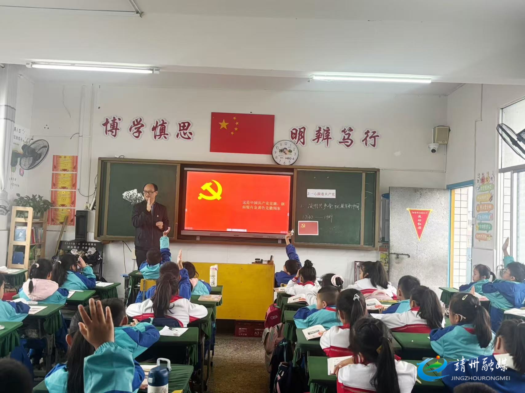 鹤山小学党员教师以《一心跟着共产党》为题开展思政课堂,通过党徽讲解、党史短视频、英雄事迹分享及主题讨论,引导学生树立正确价值观,坚定跟党走的信念。