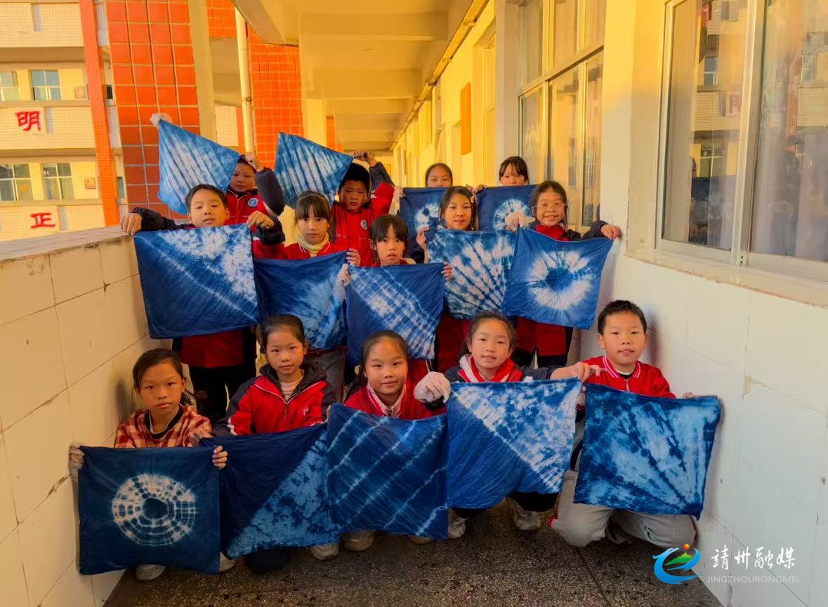 课堂上,学生全程参与折叠、捆扎、浸染、晾晒等扎染环节,在动手实践中近距离触摸非遗技艺。学生举着亲手制作的蓝白纹样扎染作品,眉眼间满是成就感,小小的扎染布被晕染出独特纹样,更让“双减”政策实施后的课后时光,成为创意与文化共生的成长课堂。