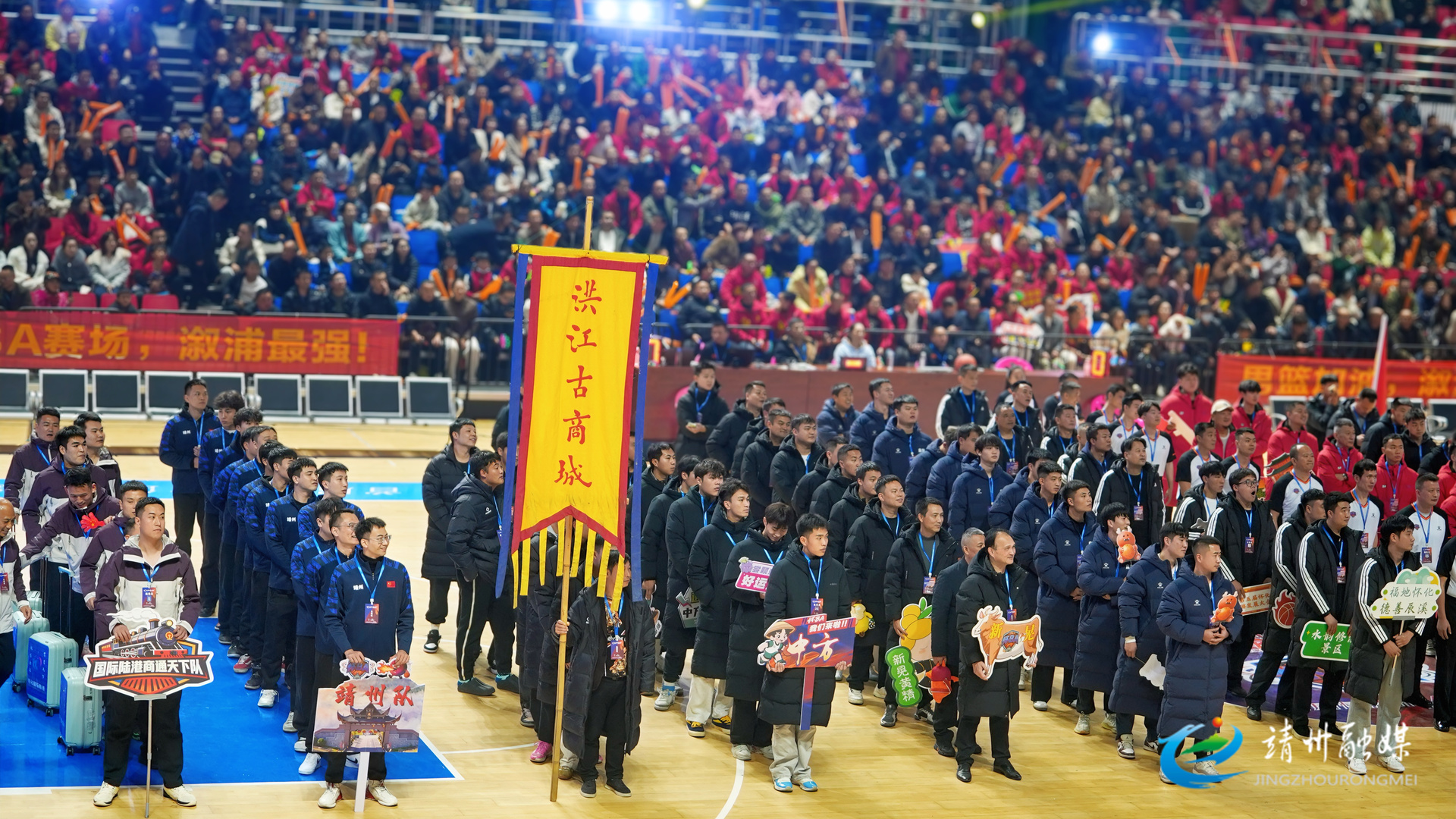 开幕式现场座无虚席,欢呼声与加油声此起彼伏。歌曲《怀化之恋》、少儿篮球操等节目活力开场,15支战队创意入场点燃现场氛围,靖州代表队队员高举印有“靖州”字样的队牌,身着苗、侗特色服饰的两名文旅推荐官托举篮球等比例仿真“杨梅”入场,篮球队员们紧随其后,将带着家乡人民的期盼,在赛场上展现苗侗儿女的拼搏精神。