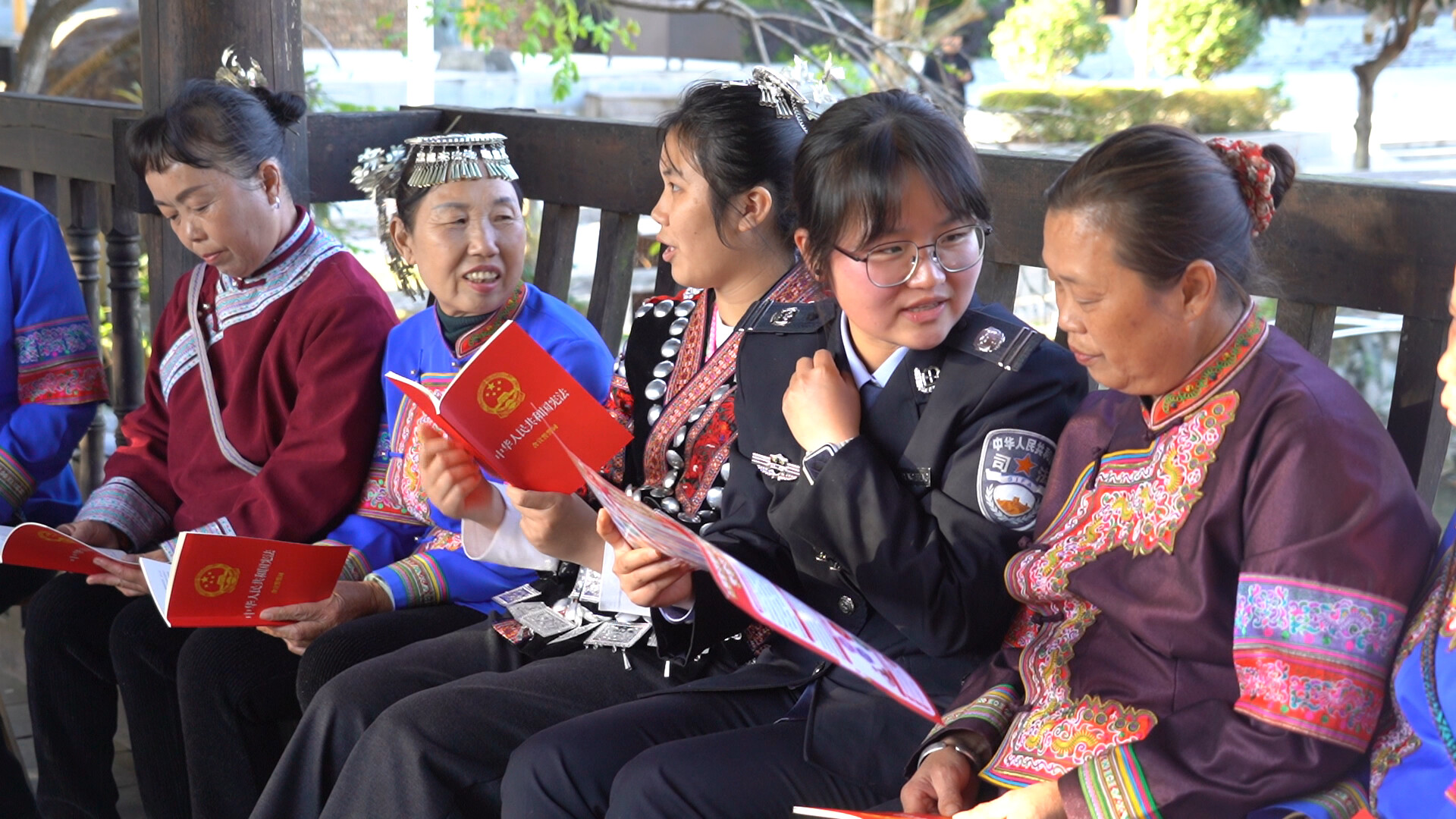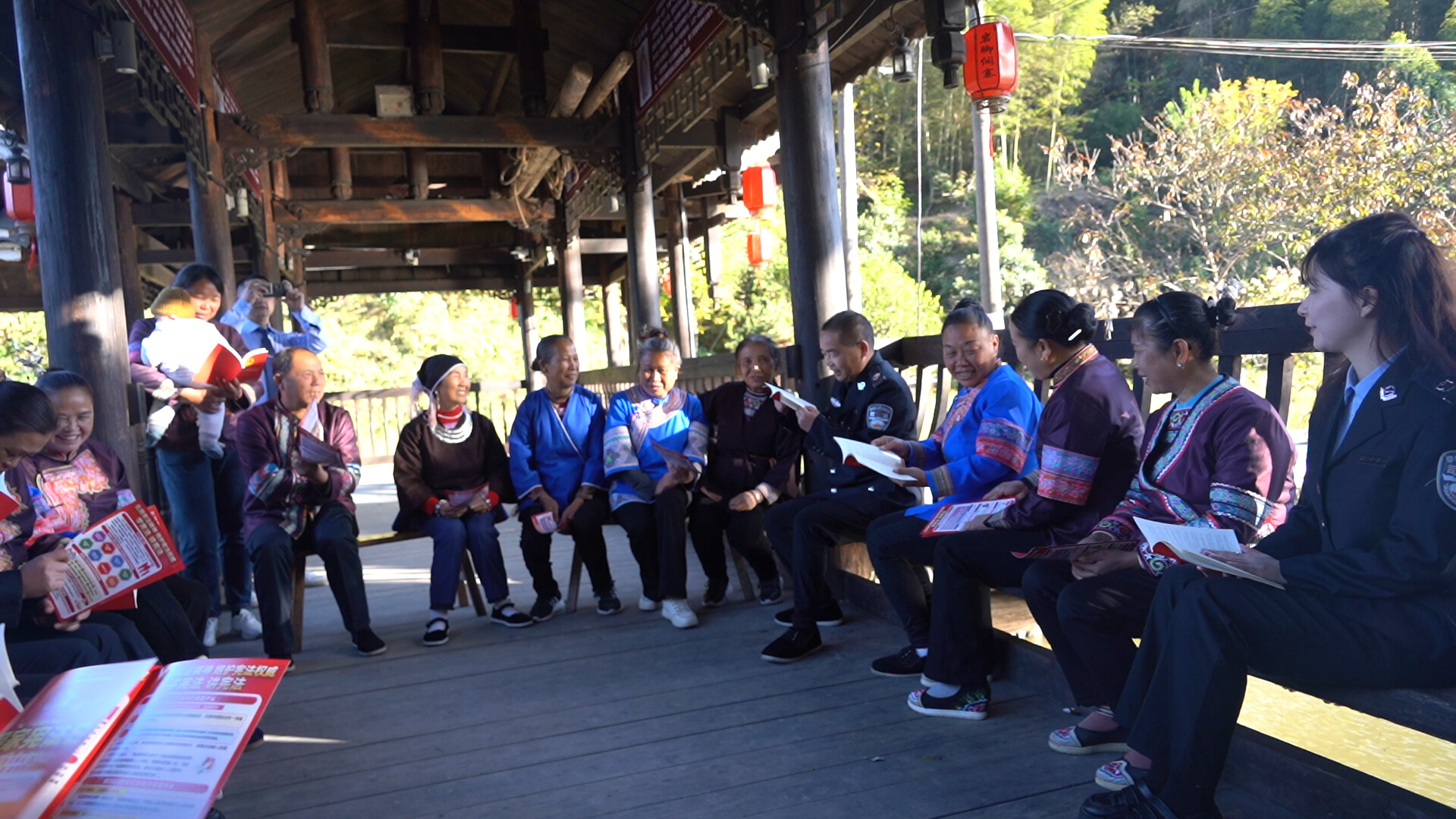 普法队向岩脚侗寨村民宣讲宪法(蒲湘萍 摄)